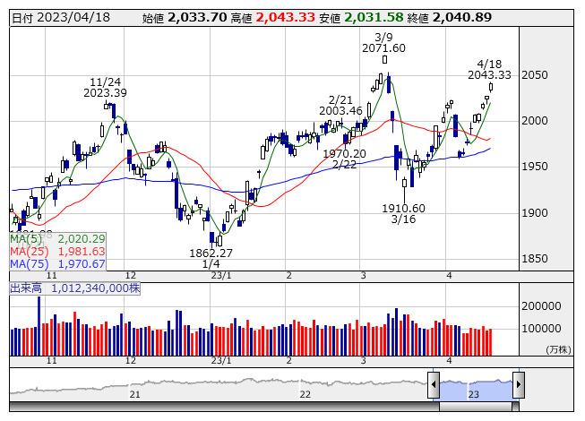 2023年04月19日08時46分 【市況】TOPIX先物:19日寄り付き=0.5ポイント高、2041.5ポイント TOPIX <日足> 「株探」多機能チャートより 19日8時45分、TOPIX先物期近2023年6月限は前日清算値比0.5ポイント高の2041.5ポイントで寄り付いた。前日のTOPIXの現物終値2040.89ポイントに対しては0.61ポイント高。夜間取引の終値2042ポイントに対しては0.5ポイント安となっている。 株探ニュース