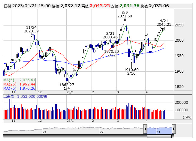 2023年04月21日15時17分 【市況】TOPIX先物:21日清算値=4.5ポイント安、2034ポイント TOPIX <日足> 「株探」多機能チャートより 21日15時15分、TOPIX先物期近2023年6月限は前日清算値比4.5ポイント安の2034ポイントで取引を終えた。出来高は4万3465枚だった。この日のTOPIXの現物終値2035.06ポイントに対しては1.06ポイント安。 株探ニュース