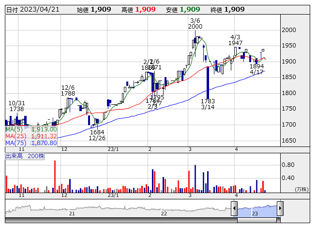 東自機 <日足> 「株探」多機能チャートより4月21日の大引け後に決算を発表した銘柄のなかから、業績好調や配当増額など市場で評価される可能性の高い銘柄を取り上げた。