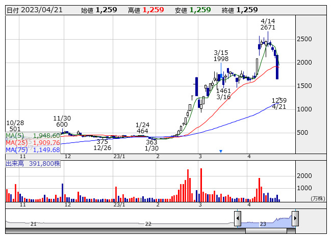 Eインフィニ <日足> 「株探」多機能チャートより(東証上場 4184 銘柄対象[ETF、REIT含む])