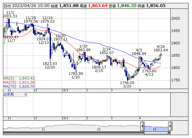 2023年04月26日15時17分 【市況】東証REIT指数先物:26日清算値=8ポイント高、1850ポイント REIT指数 <日足> 「株探」多機能チャートより 26日15時15分、東証REIT指数先物期近2023年6月限は前日清算値比8ポイント高の1850ポイントで取引を終えた。出来高は565枚だった。この日の東証REIT指数の現物終値1856.05ポイントに対しては6.05ポイント安。 株探ニュース