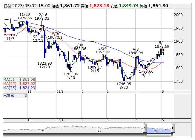 2023年05月02日15時17分 【市況】東証REIT指数先物:2日清算値=7ポイント安、1860ポイント REIT指数 <日足> 「株探」多機能チャートより 2日15時15分、東証REIT指数先物期近2023年6月限は前日清算値比7ポイント安の1860ポイントで取引を終えた。出来高は132枚だった。この日の東証REIT指数の現物終値1864.8ポイントに対しては4.8ポイント安。 株探ニュース