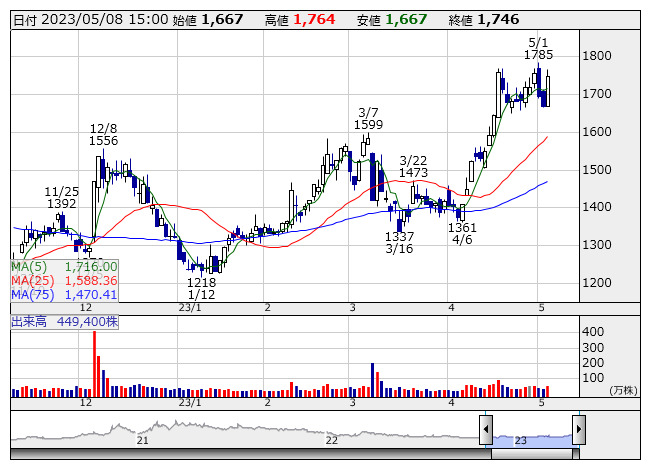 この方針に基づき、2023年7月期の1株当たり年間配当金は前期と同額の20.0円(配当性向65.6%、総還元性向99.3%)を予定している。また、資本効率の向上や経営環境に応じた柔軟な資本政策を遂行するため、自己株式の取得を実施しており、2022年10月に242,200株(取得価額の総額299百万円)を取得した。