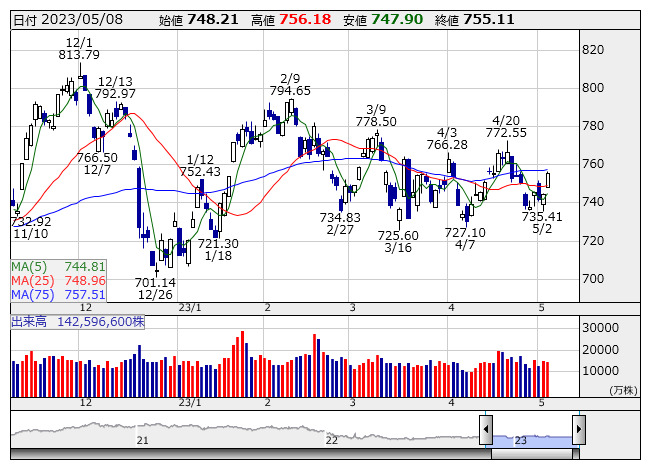 2023年05月09日08時46分 【市況】マザーズ先物:9日寄り付き=1ポイント安、749ポイント マザーズ指数 <日足> 「株探」多機能チャートより 9日8時45分、東証マザーズ指数先物期近2023年6月限は前日清算値比1ポイント安の749ポイントで寄り付いた。前日の東証マザーズ指数の現物終値755.11ポイントに対しては6.11ポイント安。夜間取引の終値750ポイントに対しては1ポイント安となっている。 株探ニュース