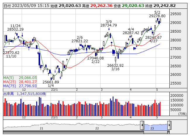2023年05月09日15時17分 【市況】日経225先物:9日清算値=290円高、2万9240円 日経平均 <日足> 「株探」多機能チャートより 9日15時15分、大阪取引所の日経225先物期近2023年6月限は前日清算値比290円高の2万9240円で取引を終えた。出来高は3万5528枚だった。この日の日経平均株価の現物終値2万9242.82円に対しては2.82円安。 株探ニュース