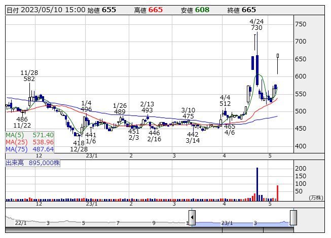 トゥルーD <日足> 「株探」多機能チャートより個別ではTrue Data<4416>、Waqoo<4937>、ピアズ<7066>がストップ高。jig.jp<5244>は一時ストップ高と値を飛ばした。ジェイグループホールディングス<3063>、海帆<3133>、ビートレンド<4020>、トヨクモ<4058>、ラキール<4074>など15銘柄は年初来高値を更新。スマサポ<9342>、サーキュレーション<7379>、BeeX<4270>、リニューアブル・ジャパン<9522>、モダリス<4883>は値上がり率上位に買われた。