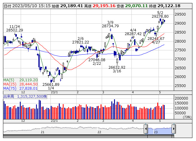 日経平均 <日足> 「株探」多機能チャートより日本取引所が公表した先物手口情報によると、5月10日の日経225ミニ期近(2023年5月限)の日中取引(立会内・J-NETの合算)で、買い越しトップはUBS証券の8750枚、売り越しトップはソシエテG証券の8059枚だった。