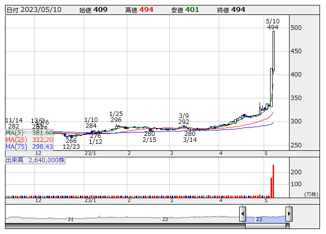 ビ花壇 <日足> 「株探」多機能チャートより(東証上場 4183 銘柄対象[ETF、REIT含む])