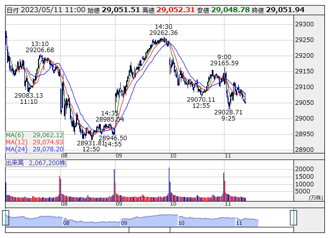 【市況】11時の日経平均は71円安の2万9050円、SBGが12.81円押し下げ