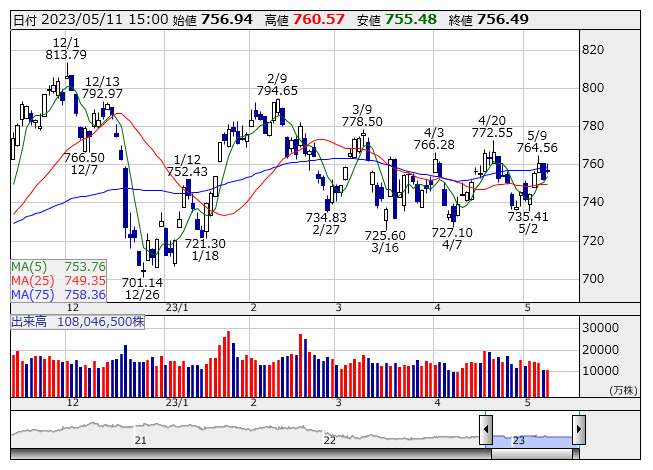 2023年05月11日15時17分 【市況】マザーズ先物:11日清算値=2ポイント安、748ポイント マザーズ指数 <日足> 「株探」多機能チャートより 11日15時15分、東証マザーズ指数先物期近2023年6月限は前日清算値比2ポイント安の748ポイントで取引を終えた。出来高は4432枚だった。この日の東証マザーズ指数の現物終値756.49ポイントに対しては8.49ポイント安。 株探ニュース
