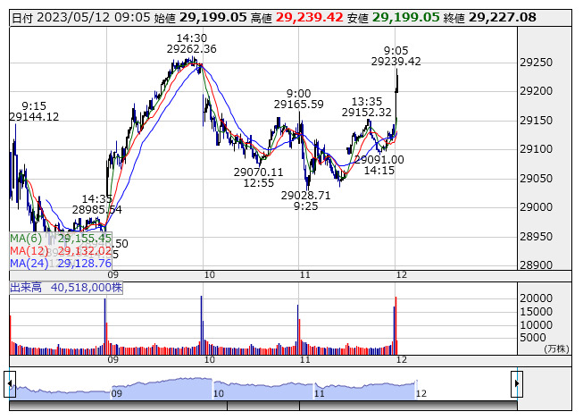 2023年05月12日09時09分 【市況】日経平均の上げ幅が100円突破 日経平均 <5分足> 「株探」多機能チャートより 日経平均株価の上げ幅が100円を突破。9時8分現在、112.70円高の2万9239.42円まで上昇している。 株探ニュース