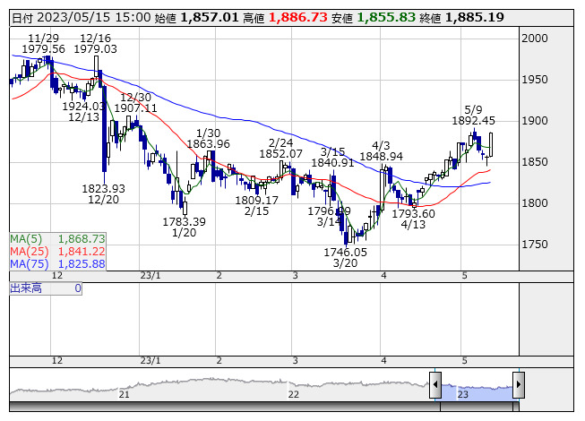 2023年05月15日15時17分 【市況】東証REIT指数先物:15日清算値=22.5ポイント高、1877ポイント REIT指数 <日足> 「株探」多機能チャートより 15日15時15分、東証REIT指数先物期近2023年6月限は前週末清算値比22.5ポイント高の1877ポイントで取引を終えた。出来高は152枚だった。この日の東証REIT指数の現物終値1885.19ポイントに対しては8.19ポイント安。 株探ニュース
