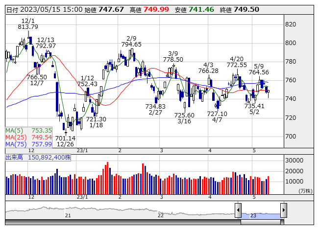 745.75ポイント 一目均衡表・先行スパン1(雲下限)