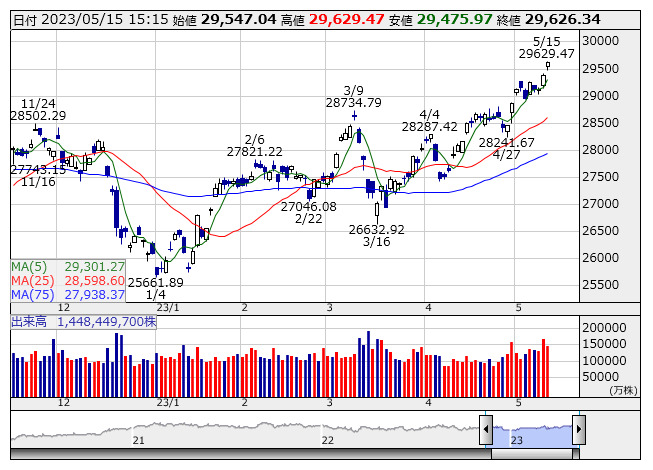日経平均 <日足> 「株探」多機能チャートより日本取引所が公表した先物手口情報によると、5月15日の日経225ミニ期近(2023年6月限)の夜間取引(立会内・J-NETの合算)で、買い越しトップはABNクリアリン証券の7494枚、売り越しトップはビーオブエー証券の7958枚だった。