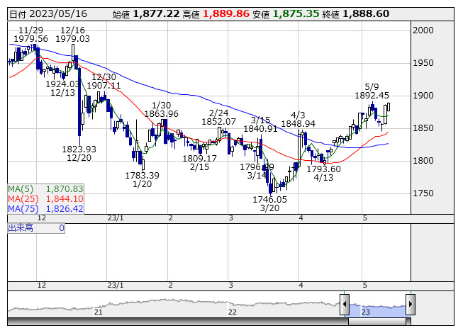 2023年05月17日08時48分 【市況】東証REIT指数先物:17日寄り付き=8ポイント高、1879ポイント REIT指数 <日足> 「株探」多機能チャートより 17日8時47分、東証REIT指数先物期近2023年6月限は前日清算値比8ポイント高の1879ポイントで寄り付いた。前日の東証REIT指数の現物終値1888.6ポイントに対しては9.6ポイント安。 株探ニュース