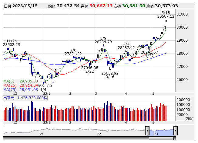 30573.93円 18日日経平均株価現物終値