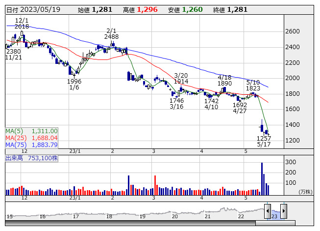 イーレックス <日足> 「株探」多機能チャートより―決算で売られた銘柄! 下落率ランキング―