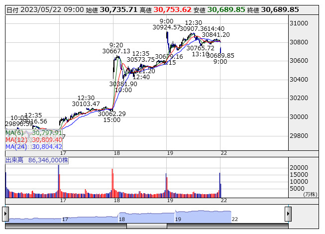 2023年05月22日09時02分 【市況】日経平均22日寄り付き=72円安、3万735円 日経平均 <5分足> 「株探」多機能チャートより 22日の日経平均株価は前週末比72.64円安の3万735.71円で寄り付いた。 株探ニュース