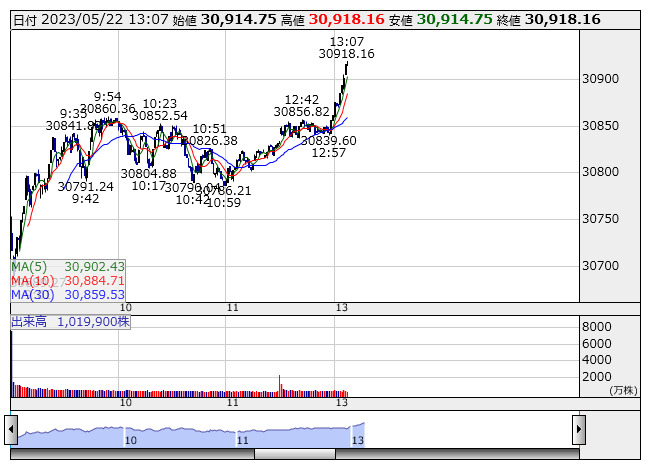 2023年05月22日13時08分 【市況】日経平均の上げ幅が100円突破 日経平均 <1分足> 「株探」多機能チャートより 日経平均株価の上げ幅が100円を突破。13時7分現在、109.81円高の3万918.16円まで上昇している。 株探ニュース