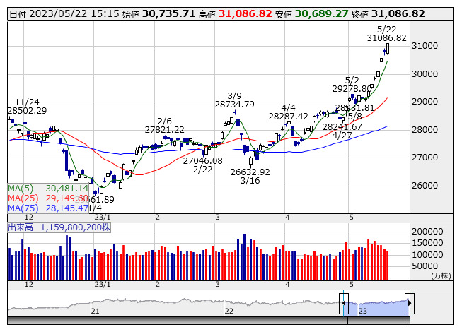 2023年05月22日16時31分 【市況】日経225先物:22日夜間取引寄り付き=20円高、3万1050円 日経平均 <日足> 「株探」多機能チャートより 22日16時30分、大阪取引所の日経225先物期近2023年6月限は日中取引の清算値比20円高の3万1050円で寄り付いた。日経平均株価の現物終値3万1086.82円に対しては36.82円安。 株探ニュース
