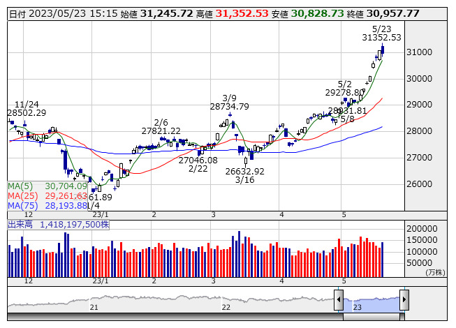 2023年05月23日15時17分 【市況】日経225先物:23日清算値=180円安、3万850円 日経平均 <日足> 「株探」多機能チャートより 23日15時15分、大阪取引所の日経225先物期近2023年6月限は前日清算値比180円安の3万850円で取引を終えた。出来高は9万9527枚だった。この日の日経平均株価の現物終値3万957.77円に対しては107.77円安。 株探ニュース