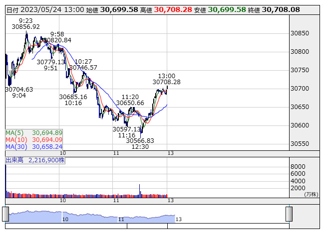【市況】13時の日経平均は256円安の3万701円、ファストリが98.62円押し下げ
