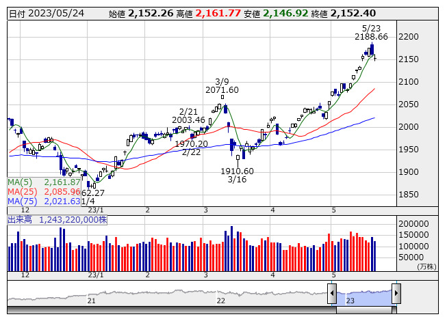 2023年05月25日08時46分 【市況】TOPIX先物:25日寄り付き=1ポイント安、2146.5ポイント TOPIX <日足> 「株探」多機能チャートより 25日8時45分、TOPIX先物期近2023年6月限は前日清算値比1ポイント安の2146.5ポイントで寄り付いた。前日のTOPIXの現物終値2152.4ポイントに対しては5.9ポイント安。夜間取引の終値2143ポイントに対しては3.5ポイント高となっている。 株探ニュース