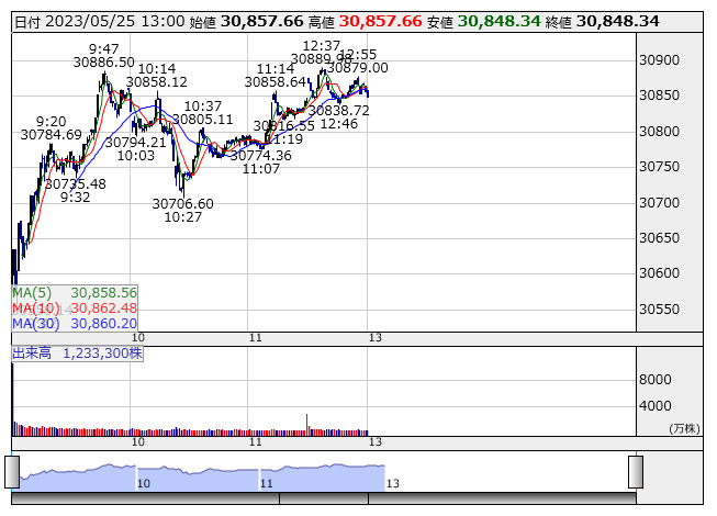 【市況】13時の日経平均は174円高の3万857円、アドテストが146.40円押し上げ
