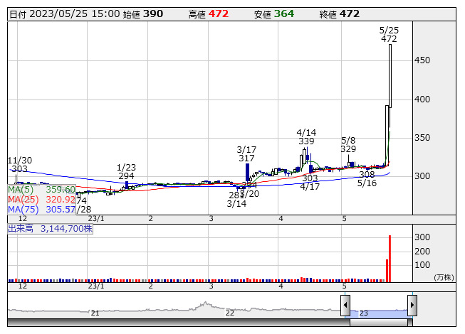 鉄人化計画 <日足> 「株探」多機能チャートより個別では鉄人化計画<2404>、ヤマシナ<5955>、エム・エイチ・グループ<9439>がストップ高。ベクター<2656>、SCAT<3974>は一時ストップ高と値を飛ばした。中小企業ホールディングス<1757>、日東富士製粉<2003>、東北新社<2329>、極楽湯ホールディングス<2340>、ライフドリンク カンパニー<2585>など42銘柄は年初来高値を更新。TBグループ<6775>、PKSHA Technology<3993>、AKIBAホールディングス<6840>、ミナトホールディングス<6862>、GMB<7214>は値上がり率上位に買われた。