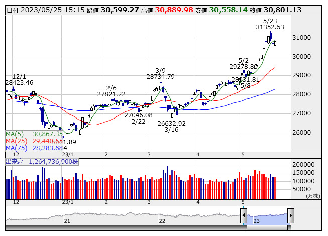 日経平均 <日足> 「株探」多機能チャートより日本取引所が公表した先物手口情報によると、5月25日の日経225先物期近(2023年6月限)の夜間取引(立会内・J-NETの合算)で、買い越しトップはHSBC証券の651枚、売り越しトップはビーオブエー証券の405枚だった。