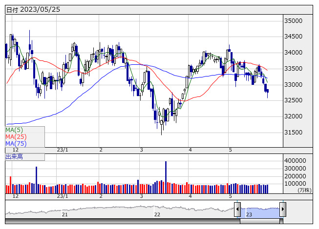 NYダウ <日足> 「株探」多機能チャートより― ダウは35ドル安と5日続落、米債務上限問題に警戒。エヌビディア<NVDA>の急騰でナスダックは反発 ―