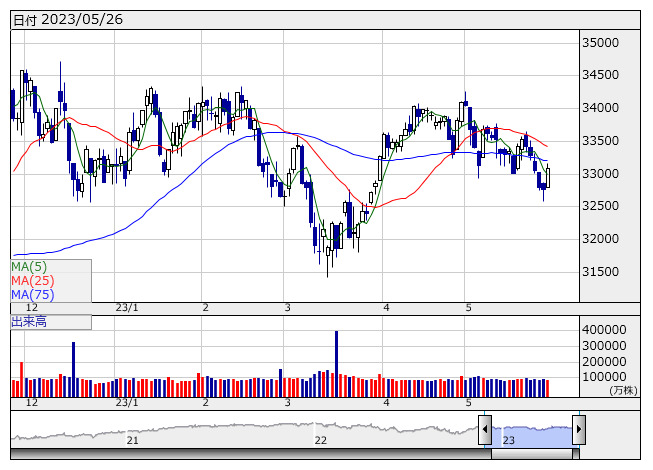 NYダウ <日足> 「株探」多機能チャートより― ダウは328ドル高と6日ぶりに反発、米債務上限問題を巡る協議の進展に期待する買い優勢 ―