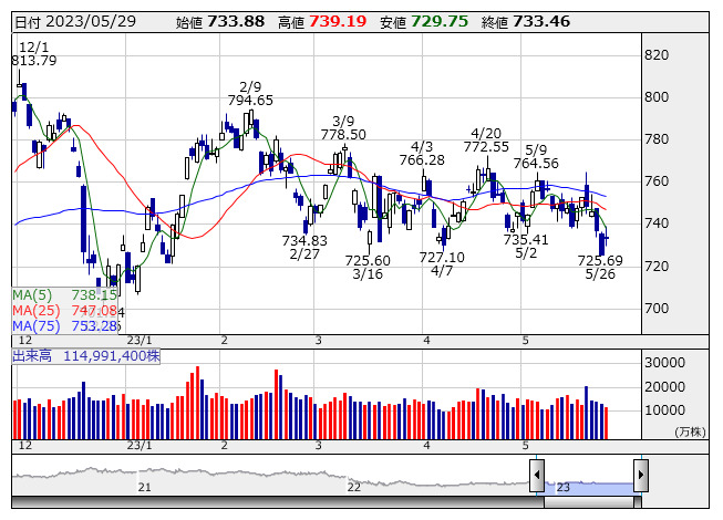 2023年05月30日08時46分 【市況】マザーズ先物:30日寄り付き=1ポイント高、734ポイント マザーズ指数 <日足> 「株探」多機能チャートより 30日8時45分、東証マザーズ指数先物期近2023年6月限は前日清算値比1ポイント高の734ポイントで寄り付いた。前日の東証マザーズ指数の現物終値733.46ポイントに対しては0.54ポイント高。夜間取引の終値734ポイントに対しては変わらずとなっている。 株探ニュース