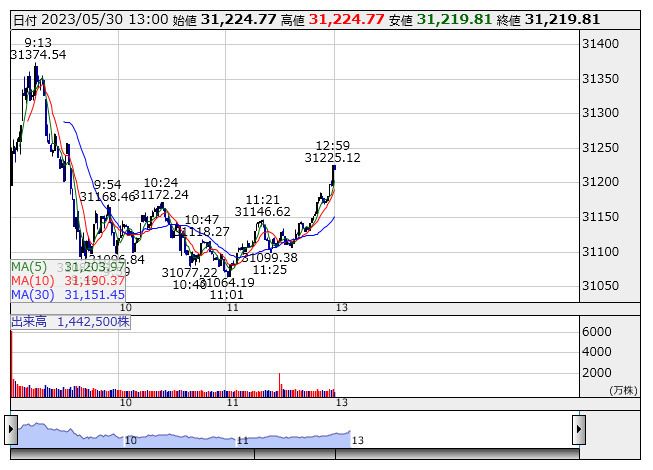 【市況】13時の日経平均は8円安の3万1224円、SBGが36.8円押し下げ