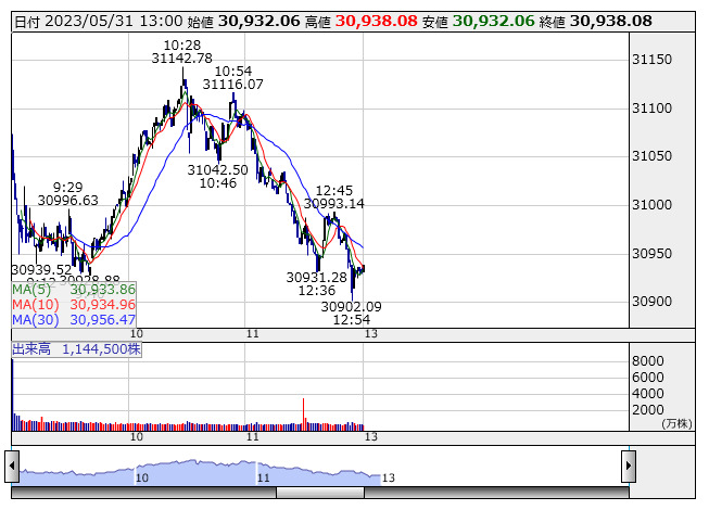 【市況】13時の日経平均は393円安の3万934円、ファストリが71.17円押し下げ