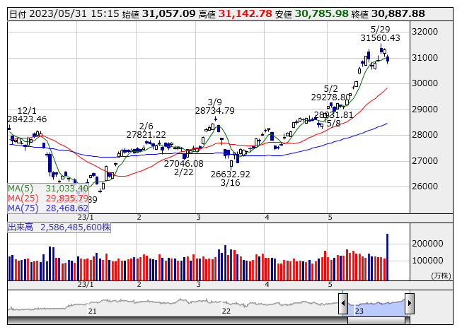 2023年05月31日15時17分 【市況】日経225先物:31日清算値=530円安、3万850円 日経平均 <日足> 「株探」多機能チャートより 31日15時15分、大阪取引所の日経225先物期近2023年6月限は前日清算値比530円安の3万850円で取引を終えた。出来高は8万5563枚だった。この日の日経平均株価の現物終値3万887.88円に対しては37.88円安。 株探ニュース