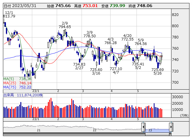 2023年06月01日08時46分 【市況】マザーズ先物:1日寄り付き=1ポイント高、746ポイント マザーズ指数 <日足> 「株探」多機能チャートより 1日8時45分、東証マザーズ指数先物期近2023年6月限は前日清算値比1ポイント高の746ポイントで寄り付いた。前日の東証マザーズ指数の現物終値748.06ポイントに対しては2.06ポイント安。夜間取引の終値746ポイントに対しては変わらずとなっている。 株探ニュース