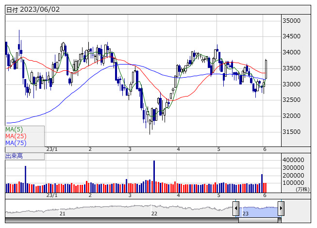 NYダウ <日足> 「株探」多機能チャートより― ダウは701ドル高と続伸、債務上限法案通過や雇用統計を受けて急伸 ―