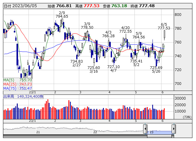 2023年06月06日08時46分 【市況】マザーズ先物:6日寄り付き=8ポイント安、773ポイント マザーズ指数 <日足> 「株探」多機能チャートより 6日8時45分、東証マザーズ指数先物期近2023年6月限は前日清算値比8ポイント安の773ポイントで寄り付いた。前日の東証マザーズ指数の現物終値777.48ポイントに対しては4.48ポイント安。夜間取引の終値774ポイントに対しては1ポイント安となっている。 株探ニュース