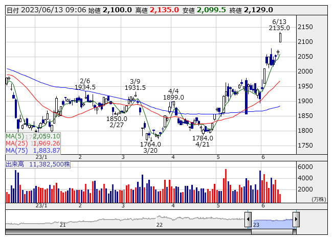 6. <6723> ルネサス 東証P 1,989 2539 ( +2.6 ) 日経225・JPX日経400採用