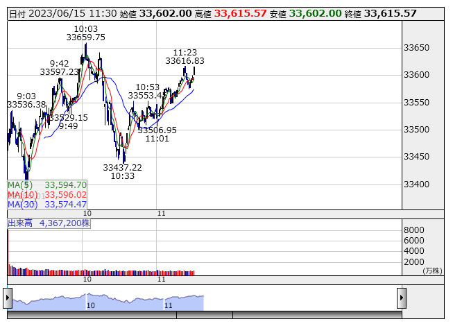 【市況】日経平均15日前引け=5日続伸、113円高の3万3615円