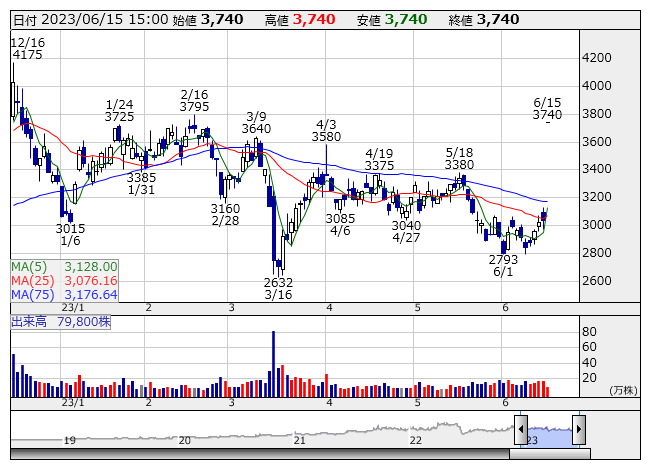 MSOL <日足> 「株探」多機能チャートよりマネジメントソリューションズ<7033>がストップ高。14日の取引終了後に発表した23年10月期第2四半期累計(22年11月~23年4月)の連結決算は、営業利益が前年同期比3.6倍の8億100万円となった。2~4月期では同19倍と、第1四半期(22年11月~23年1月)の営業増益率(16.6%)を大きく上回った。また、同日にプロジェクトマネジメントソフトウェア「PROEVER」(プロエバー)で、生成AIを活用したAIコンシェルジュ機能の提供を開始するとも発表しており、これらを材料視した買いが集まったようだ。第2四半期累計の売上高は同54.3%増の80億3300万円だった。取引先企業数が増加したことに加え、採用エージェント以外での採用を強化したことで、採用費の抑制にも成功した。