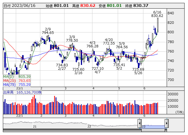 2023年06月19日08時46分 【市況】マザーズ先物:19日寄り付き=11ポイント高、839ポイント マザーズ指数 <日足> 「株探」多機能チャートより 19日8時45分、東証マザーズ指数先物期近2023年9月限は前週末清算値比11ポイント高の839ポイントで寄り付いた。前週末の東証マザーズ指数の現物終値830.37ポイントに対しては8.63ポイント高。夜間取引の終値832ポイントに対しては7ポイント高となっている。 株探ニュース