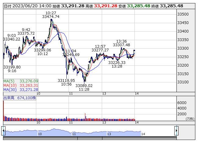 【市況】14時の日経平均は84円安の3万3285円、KDDIが19.11円押し下げ