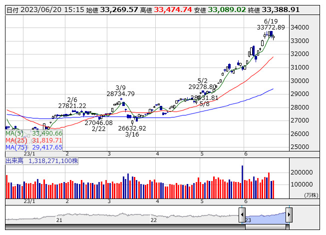 日経平均は前日比18.49円(0.06%)高の3万3388.91円。TOPIXは前日比6.65(0.29%)安の2283.85。出来高は概算で13億1827万株。東証プライムの値上がり銘柄数は777、値下がり銘柄数は971となった。東証マザーズ指数は858.34ポイント(5.97ポイント高)。