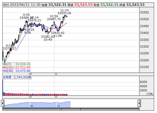 日経平均 <1分足> 「株探」多機能チャートより個別ではNEXT 建設・資材 <1619> 、iシェアーズ米国債1-3年ETF <2620> 、トップシェアインデックス(ネットリターン)ETN <2072> 、東証マザーズETF <2516> 、東証グロース・コアETF <1563> など11銘柄が新高値。