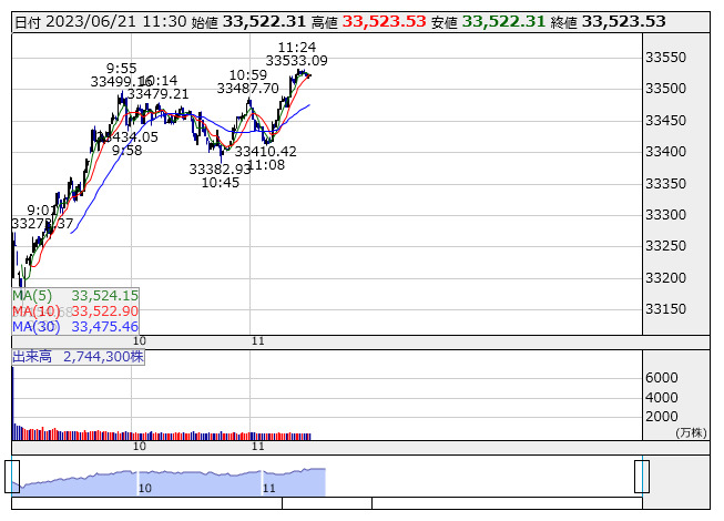 【市況】日経225先物:21日正午=110円高、3万3450円