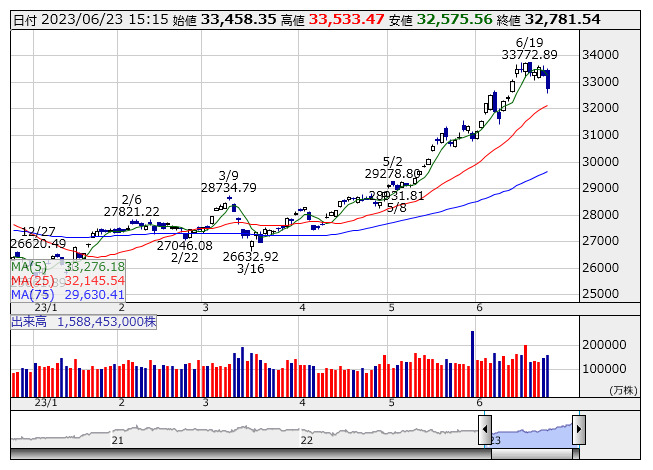 日経平均 <日足> 「株探」多機能チャートより日本取引所が公表した先物手口情報によると、6月23日の日経225ミニ期近(2023年7月限)の夜間取引(立会内・J-NETの合算)で、買い越しトップはソシエテG証券の145枚、売り越しトップは楽天証券の69枚だった。