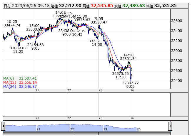 日経平均 <5分足> 売買代金 「株探」多機能チャートより個別ではiシェアーズ米国債1-3年ETF <2620> 、上場インデックスファンド米国債券(為替ヘッジなし) <1486> 、NEXT FUNDSFTSE世界国債 <2511> 、NEXT アセアン好配当ETN <2043> 、NEXT ブルームバーグ米国国債 為替ヘッジなし <2647> など10銘柄が新高値。