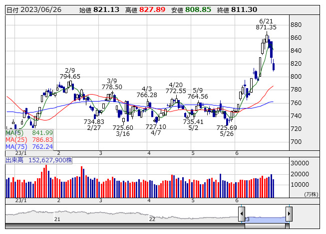 マザーズ指数 <日足> 「株探」多機能チャートより910.06ポイント ボリンジャーバンド3σ